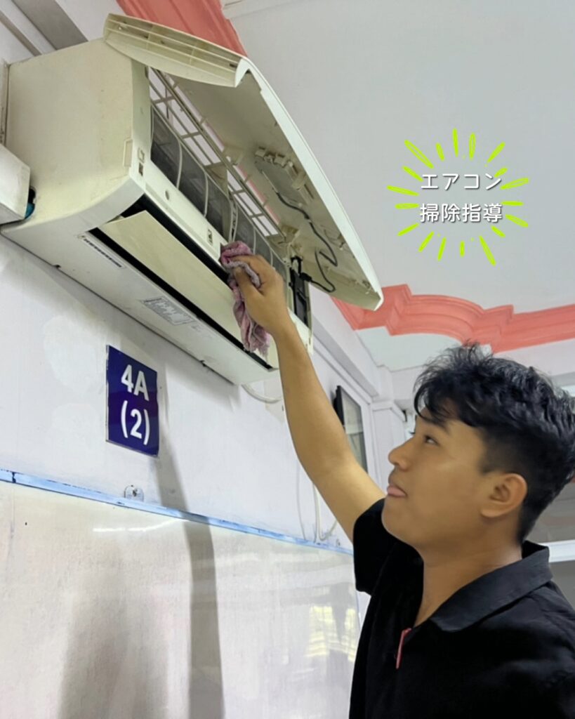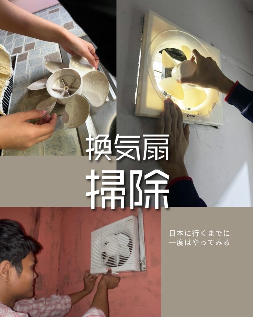 教師が横につき、換気扇の外し方、洗い方、戻し方まで、